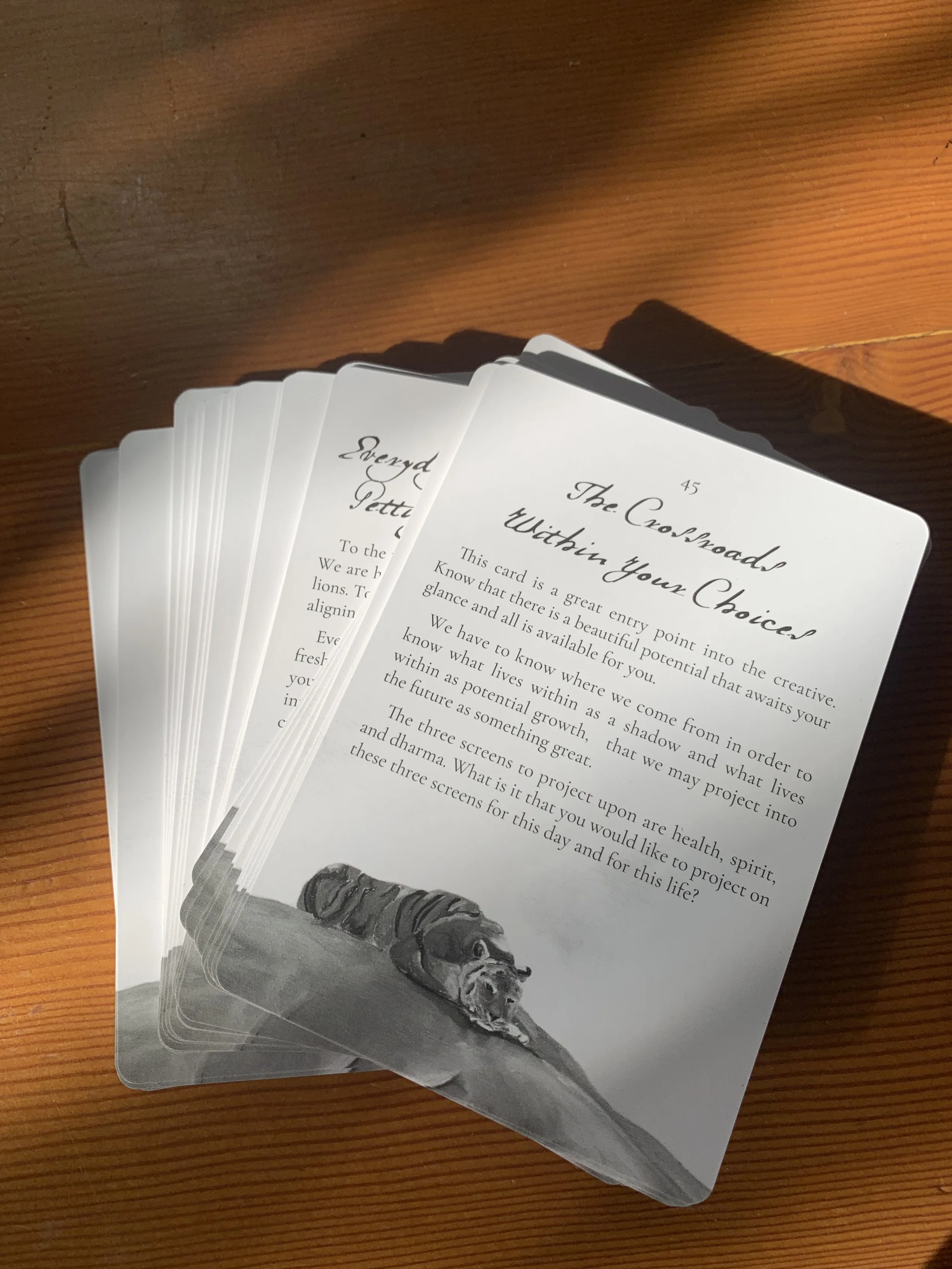 This deck is intended to inspire a new language for a new paradigm. It is a vehicle to take delight in one’s life, as an insider, enjoying the breath of each fresh moment.